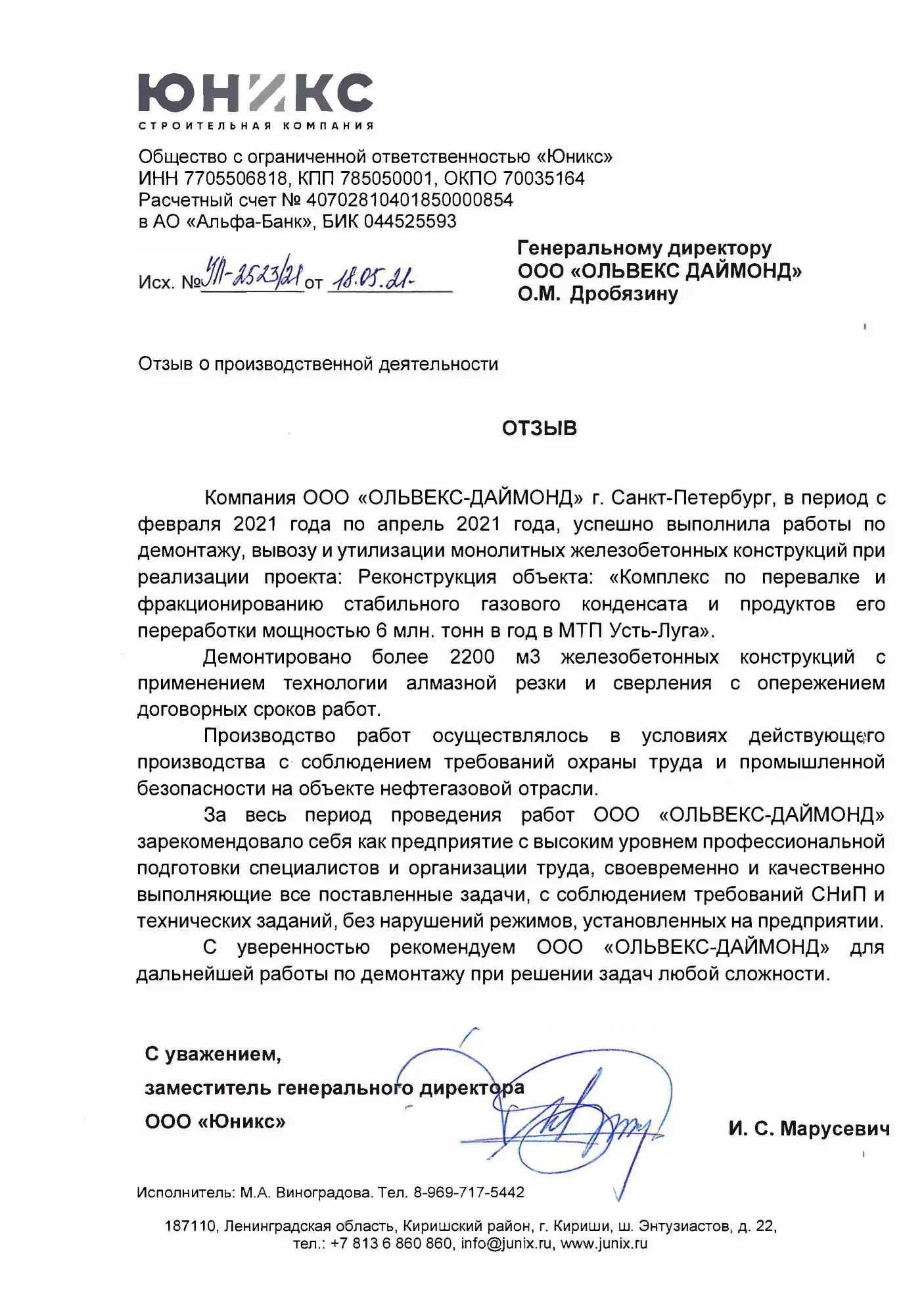 Компания ООО «ОЛЬВЕКС-ДАЙМОНД» — это предприятие, работающее на рынке специальных строительных услуг (механизированный демонтаж). Головной офис находится в Санкт-Петербурге, в Москве и Петрозаводске функционируют филиалы компании, а деятельность ООО «ОЛЬВЕКС-ДАЙМОНД» ведется на всей территории Российской Федерации и даже в некоторых странах ближнего зарубежья.